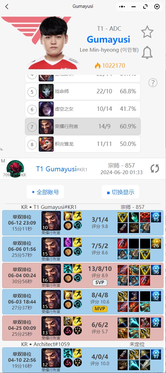 根据韩服排位统计小程序显示,Gumayusi德莱文的出装有自己的独特理解,在排位中多次使用三项(根据比赛情况,首件装备可能出饮血剑)、破舰者、血手出装的德莱文,并打出不错的效果。