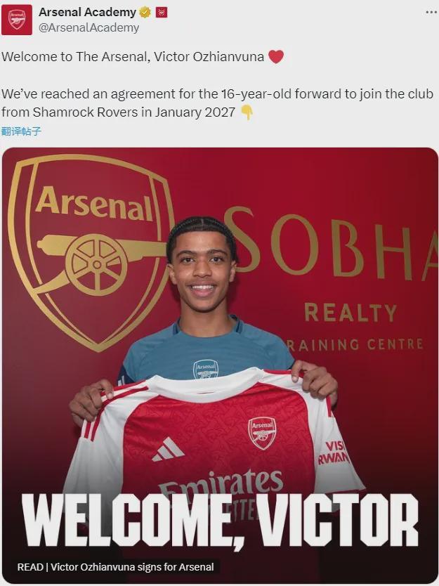 官方:阿森纳宣布和沙姆洛克流浪者就维克托-奥日安武纳的转会达成了协议,这名16岁的新星将在2027年1月份年满18周岁后正式登陆北伦敦。