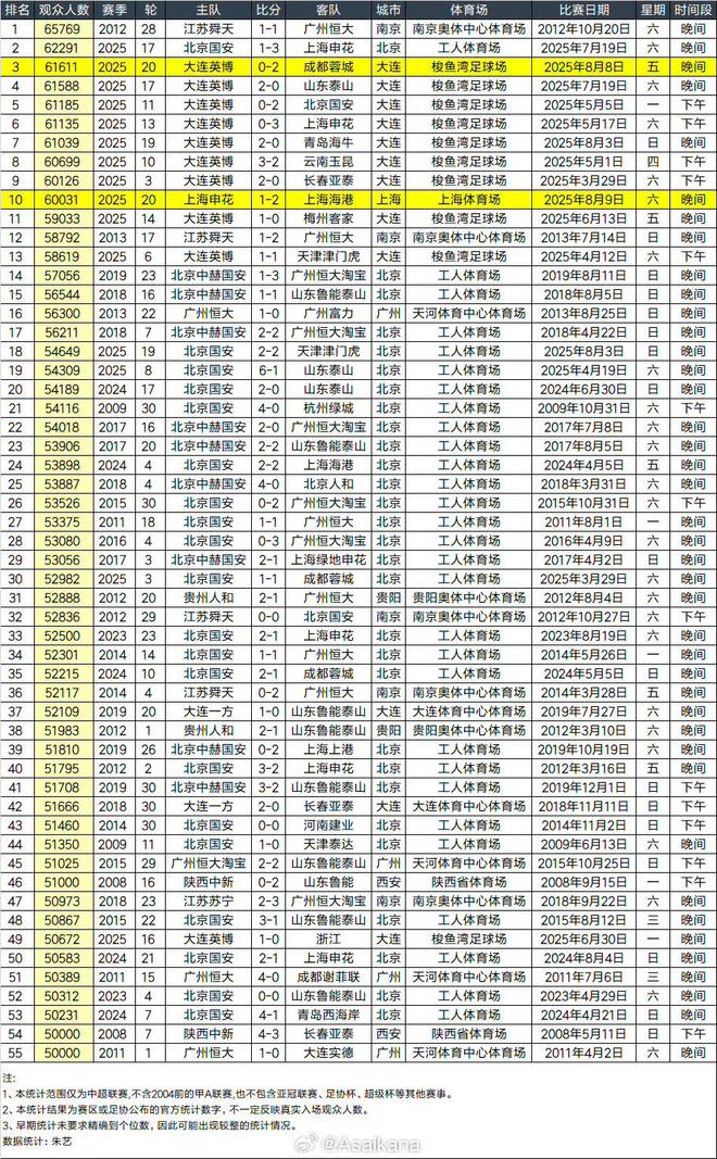 雷速体育10月4日宣 2025中超联赛第23轮补赛,大连英博坐镇主场迎战青岛西海岸,本场比赛的上座人数为61616人,这一人数也创下了梭鱼湾足球场上座人数的历史新高,排在中超历史第三位。