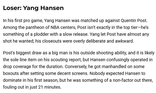 杨瀚森本场迎来季前赛首秀,出场21分钟,5投2中,得到4分4篮板1助攻4失误,最后时刻犯满离场。赛后波特兰媒体Rip City Project对部分球员的表现了进行了点评,其中提到了杨瀚森,将他列为了本场比赛的输家之一。