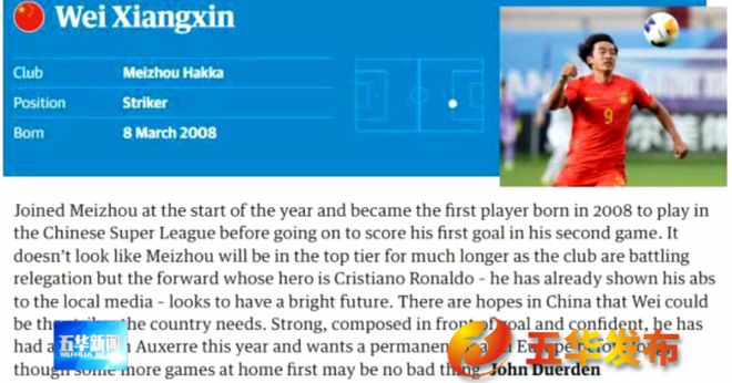 《卫报》在对魏祥鑫的评语中,给出了高度评价与中肯建议:“今年年初加盟梅州客家,成为第一位在中超踢球的2008年出生的球员,他在第二场比赛中打进了职业生涯的第一个进球,看起来他有着光明的未来。这位前锋的偶像是C罗,他已经向中国的媒体展示了他的腹肌。在中国,球迷希望魏祥鑫能成为国家队需要的前锋。他强壮、沉着、自信,今年在欧塞尔试训过,希望不久之后能在欧洲永久效力,不过先在国内多踢一些比赛也不是坏事。”