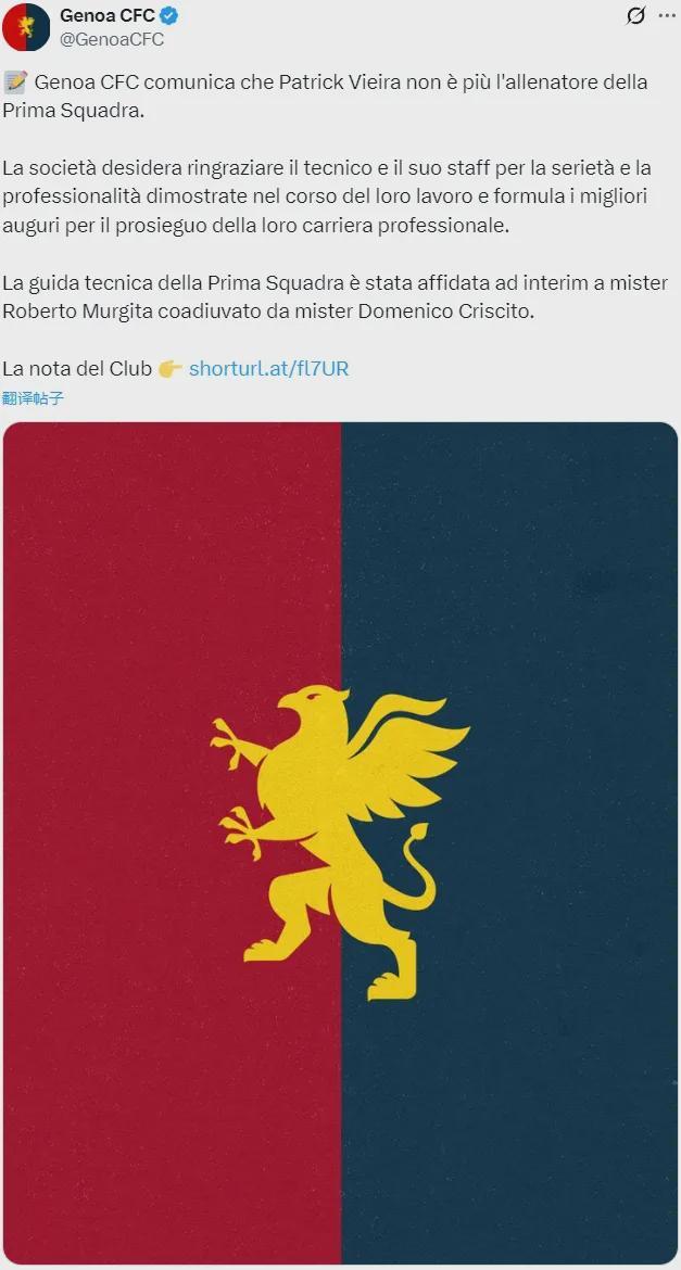 官方:热那亚宣布解雇了主帅维埃拉。