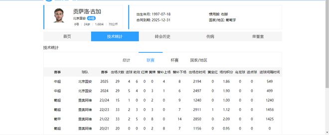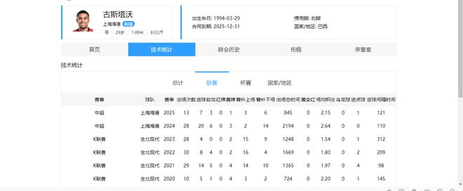 本赛季,古斯塔沃共代表海港出战13场联赛,累计打进7球,送出3记助攻。
