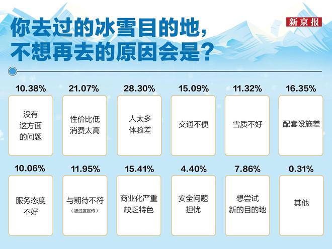 从冰雪目的地的选择上来看,Z世代的选择高度集中。《报告》显示,超过八成受访者将东北列为冰雪游首选,哈尔滨以近七成的提及率领先。但与此同时,“人太多体验差”是Z世代不想再去某目的地的首要原因,占比达28.3%,“性价比低”和“配套设施差”紧随其后。